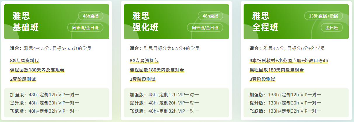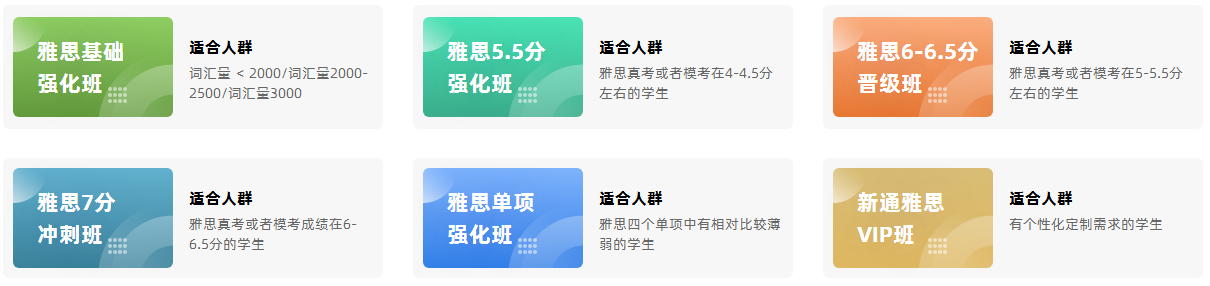 2. 0基础到7分,多种班型,给你更多雅思学习选择 雅思基础班/5.5分班/6-6.5分班/7分班:0基础到7分,新通雅思课程满足所需 面授/网课/集训班:面对面讲解更直观,问题及时解决;时间自由,直播/回放,学习更方便;突击强化训练,短时间内急速提高。 大班/小班/VIP班:建立良好竞争,方便经验交流;更多展示锻炼机会,针对性强;一对一服务,满足所需。 全日班/晚班/周末班:助于养成良好学习习惯,稳步提升;合理利用时间,灵活自由;平衡工作生活,互不影响,集中提高。 |